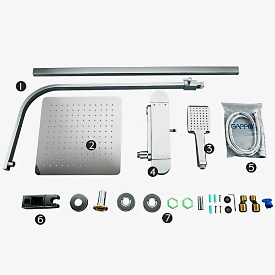 Аэратор, Металлическая розетка, Эксцентрики, Душевой шланг, Душевая лейка, Держатель для душевой лейки, Верхний душ, Кронштейн, Штанга душевая, Термостат