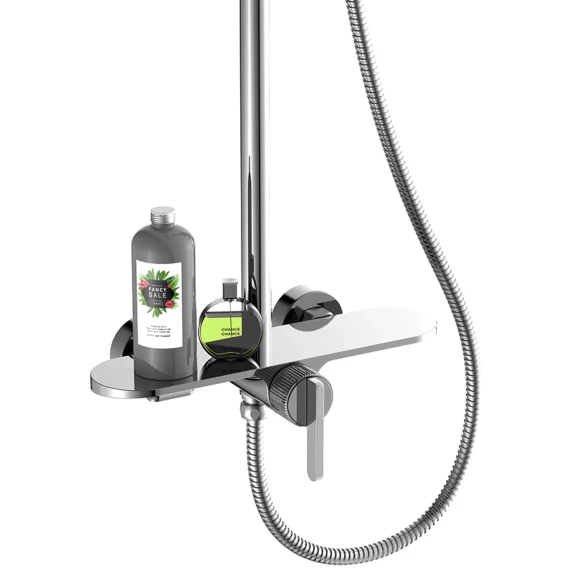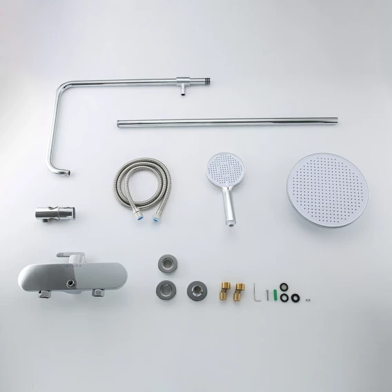 Аэратор, Металлическая розетка, Эксцентрики, Душевой шланг, Душевая лейка, Держатель для душевой лейки, Полочка, Верхний душ, Смеситель, Кронштейн, Штанга душевая