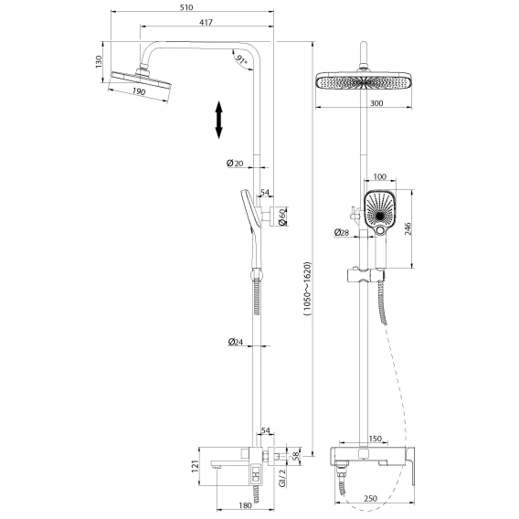 Аэратор, Металлическая розетка, Эксцентрики, Душевой шланг, Душевая лейка, Держатель для душевой лейки, Верхний душ, Смеситель, Кронштейн, Штанга душевая