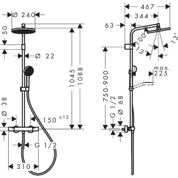• размер держателя верхнего душа: 344 мм