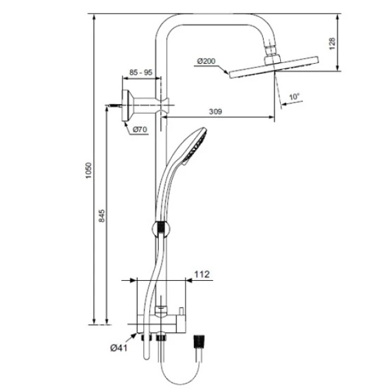 • Верхний душ 200 мм, пластик, шаровое соединение; душевая труба Ø 25 мм для верхнего душа, ручное переключение