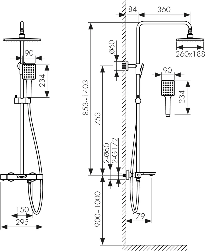 Аэратор, Металлическая розетка, Эксцентрики, Душевой шланг, Душевая лейка, Держатель для душевой лейки, Верхний душ, Кронштейн, Штанга душевая, Термостат
