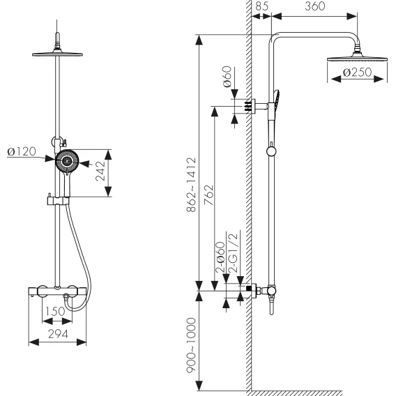 Металлическая розетка, Эксцентрики, Душевой шланг, Душевая лейка, Держатель для душевой лейки, Верхний душ, Кронштейн, Штанга душевая, Термостат