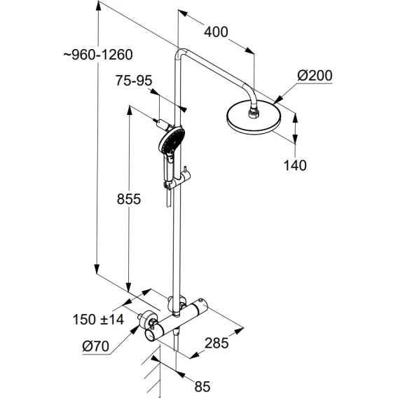 Металлическая розетка, Эксцентрики, Душевой шланг, Душевая лейка, Держатель для душевой лейки, Верхний душ, Кронштейн, Штанга душевая, Термостат