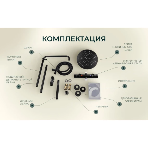 Металлическая розетка, Эксцентрики, Душевой шланг, Душевая лейка, Держатель для душевой лейки, Кронштейн, Штанга душевая, Термостат