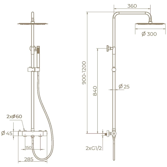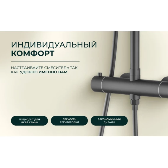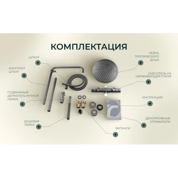 Металлическая розетка, Эксцентрики, Душевой шланг, Душевая лейка, Держатель для душевой лейки, Кронштейн, Штанга душевая, Термостат