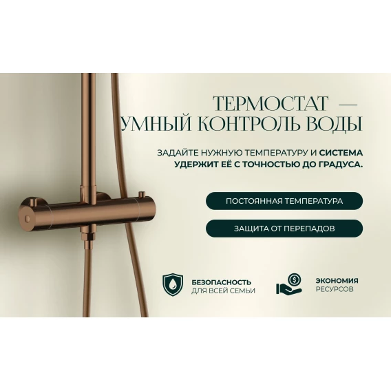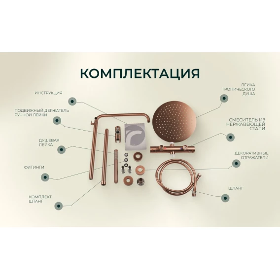 Металлическая розетка, Эксцентрики, Душевой шланг, Душевая лейка, Держатель для душевой лейки, Кронштейн, Штанга душевая, Термостат