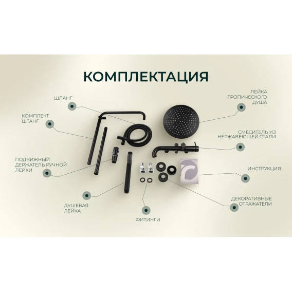 Аэратор, Металлическая розетка, Эксцентрики, Душевой шланг, Душевая лейка, Держатель для душевой лейки, Смеситель, Кронштейн, Штанга душевая