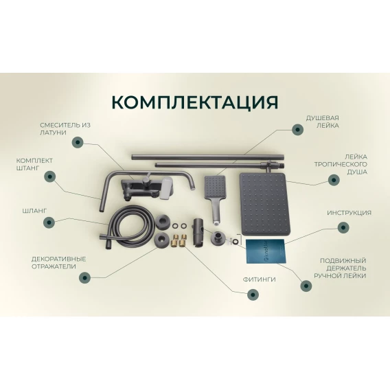 Аэратор, Металлическая розетка, Эксцентрики, Душевой шланг, Душевая лейка, Держатель для душевой лейки, Смеситель, Кронштейн, Штанга душевая