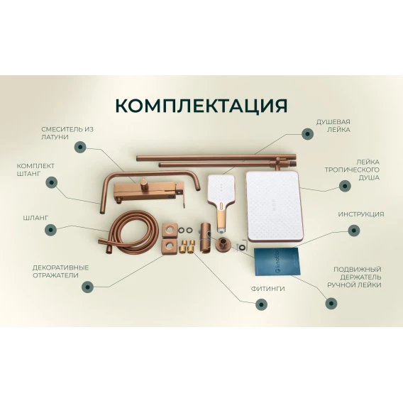 Аэратор, Металлическая розетка, Эксцентрики, Душевой шланг, Душевая лейка, Держатель для душевой лейки, Смеситель, Кронштейн, Штанга душевая