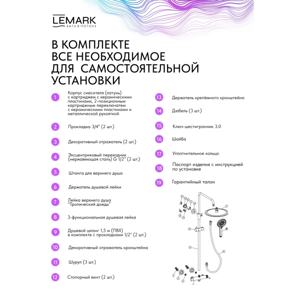Металлическая розетка, Эксцентрики, Душевой шланг, Душевая лейка, Держатель для душевой лейки, Верхний душ, Смеситель, Кронштейн, Штанга душевая