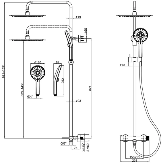 Металлическая розетка, Эксцентрики, Душевой шланг, Душевая лейка, Держатель для душевой лейки, Верхний душ, Смеситель, Кронштейн, Штанга душевая