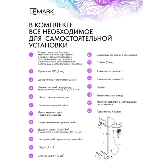 Металлическая розетка, Эксцентрики, Душевой шланг, Душевая лейка, Держатель для душевой лейки, Верхний душ, Кронштейн, Штанга душевая, Термостат