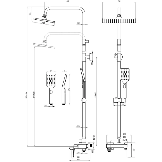Аэратор, Металлическая розетка, Эксцентрики, Душевой шланг, Душевая лейка, Держатель для душевой лейки, Верхний душ, Смеситель, Кронштейн, Штанга душевая