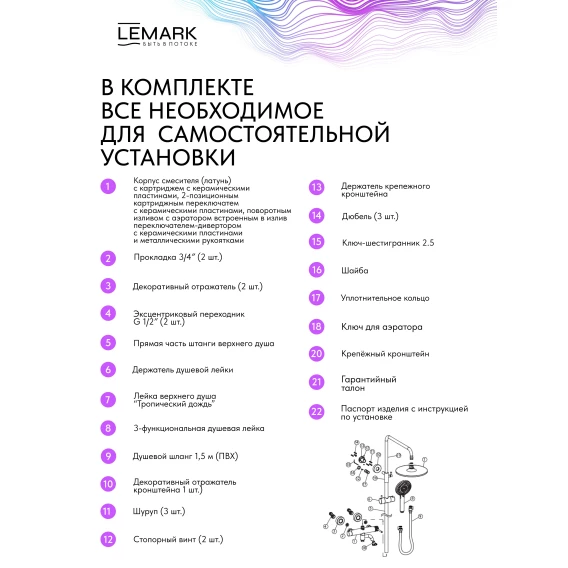 Аэратор, Металлическая розетка, Эксцентрики, Душевой шланг, Душевая лейка, Держатель для душевой лейки, Верхний душ, Смеситель, Кронштейн, Штанга душевая
