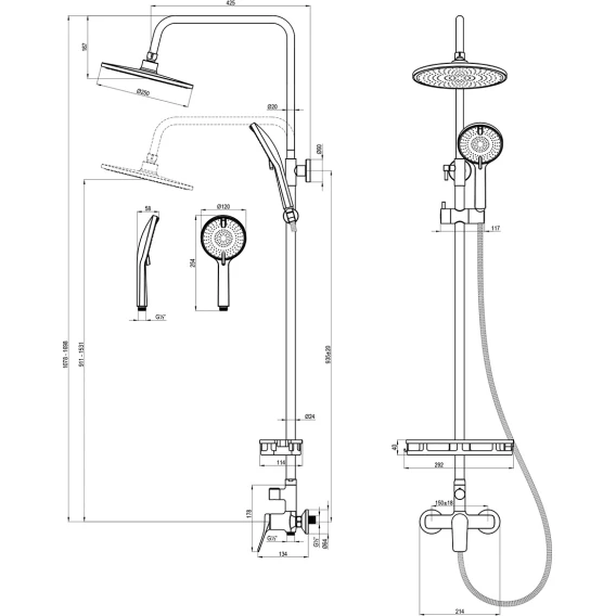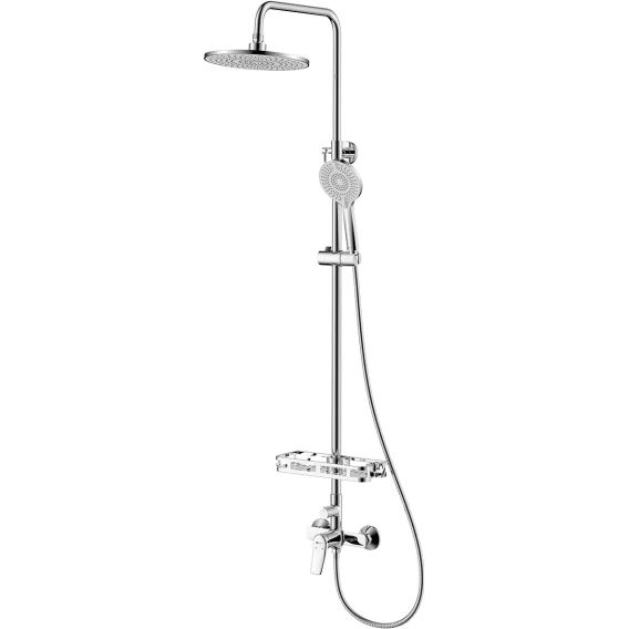 Металлическая розетка, Эксцентрики, Душевой шланг, Душевая лейка, Держатель для душевой лейки, Полочка, Верхний душ, Смеситель, Кронштейн, Штанга душевая