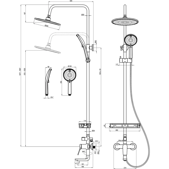 Аэратор, Металлическая розетка, Эксцентрики, Душевой шланг, Душевая лейка, Держатель для душевой лейки, Полочка, Смеситель, Кронштейн, Штанга душевая