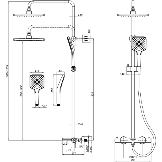 Аэратор, Металлическая розетка, Эксцентрики, Душевой шланг, Душевая лейка, Держатель для душевой лейки, Верхний душ, Кронштейн, Штанга душевая, Термостат