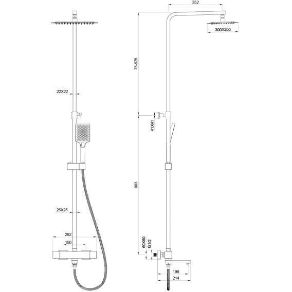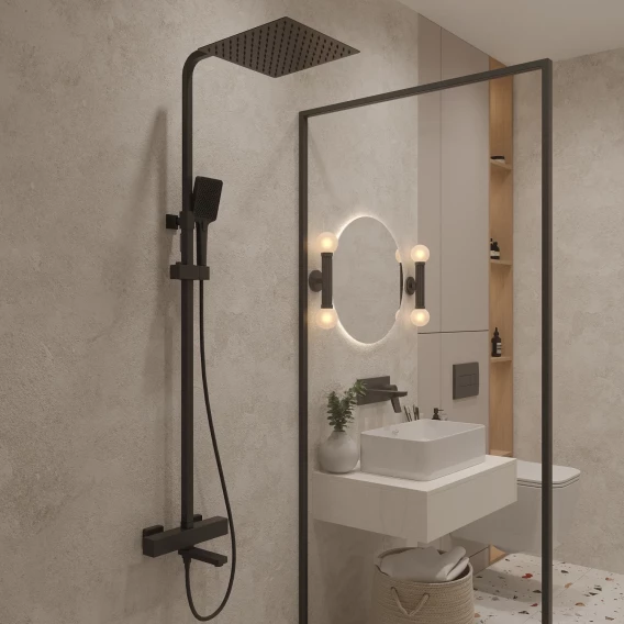 Аэратор, Металлическая розетка, Эксцентрики, Душевой шланг, Душевая лейка, Держатель для душевой лейки, Верхний душ, Кронштейн, Штанга душевая, Термостат