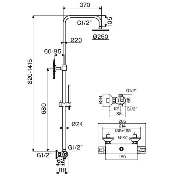 Металлическая розетка, Эксцентрики, Душевой шланг, Душевая лейка, Держатель для душевой лейки, Верхний душ, Кронштейн, Штанга душевая, Термостат