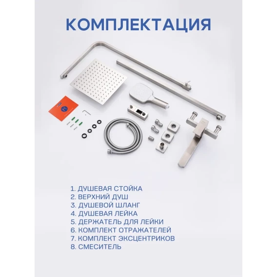 Аэратор, Металлическая розетка, Эксцентрики, Душевой шланг, Душевая лейка, Держатель для душевой лейки, Верхний душ, Смеситель, Кронштейн, Штанга душевая