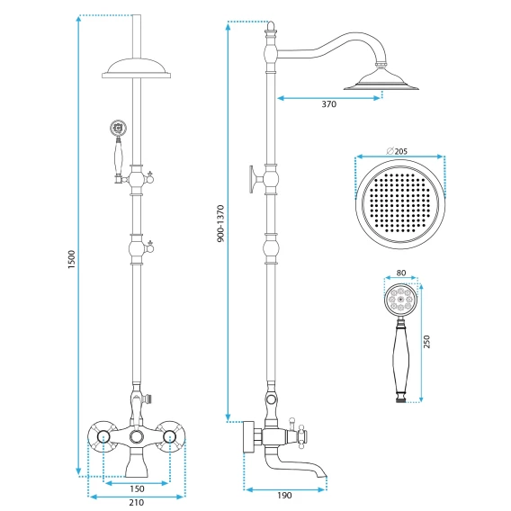 Аэратор, Металлическая розетка, Эксцентрики, Душевой шланг, Душевая лейка, Держатель для душевой лейки, Верхний душ, Смеситель, Кронштейн, Штанга душевая