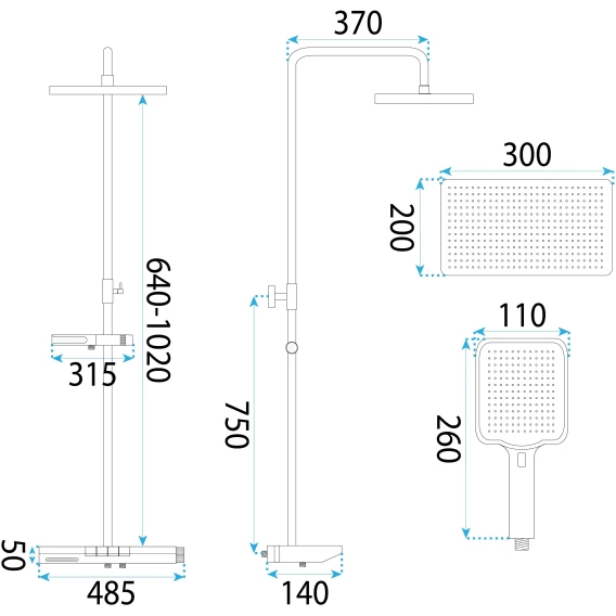 Аэратор, Эксцентрики, Душевой шланг, Душевая лейка, Держатель для душевой лейки, Полочка, Верхний душ, Кронштейн, Штанга душевая, Термостат