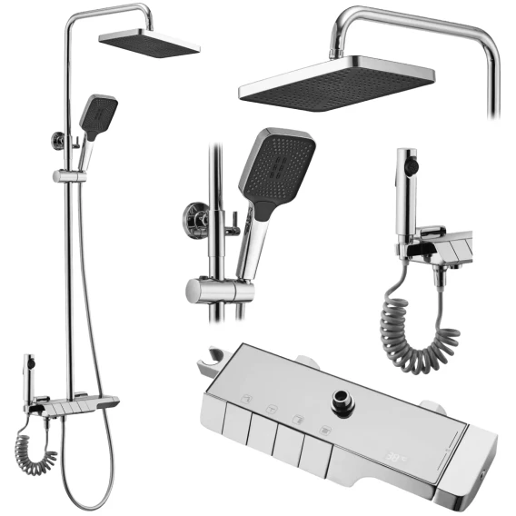 Аэратор, Металлическая розетка, Эксцентрики, Душевой шланг, Душевая лейка, Держатель для душевой лейки, Верхний душ, Кронштейн, Штанга душевая, Термостат