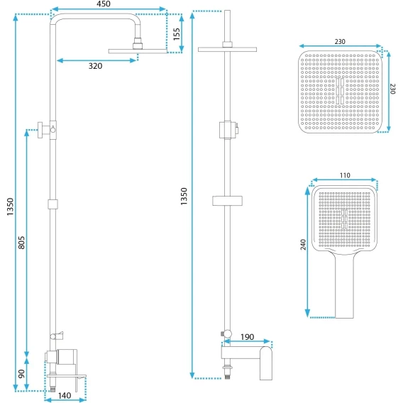 Аэратор, Металлическая розетка, Эксцентрики, Душевой шланг, Душевая лейка, Держатель для душевой лейки, Верхний душ, Смеситель, Кронштейн, Штанга душевая