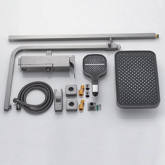 Аэратор, Металлическая розетка, Эксцентрики, Душевой шланг, Душевая лейка, Держатель для душевой лейки, Полочка, Верхний душ, Смеситель, Кронштейн, Штанга душевая
