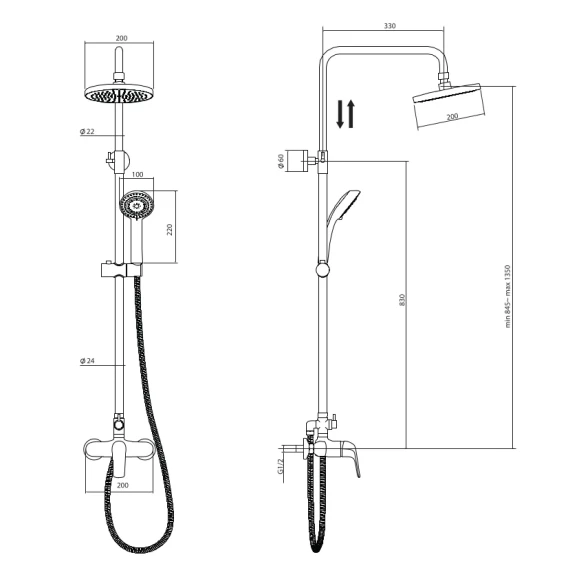 Металлическая розетка, Эксцентрики, Душевой шланг, Душевая лейка, Держатель для душевой лейки, Верхний душ, Смеситель, Кронштейн, Штанга душевая