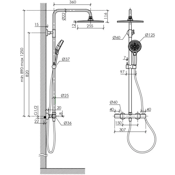 Металлическая розетка, Эксцентрики, Душевой шланг, Душевая лейка, Держатель для душевой лейки, Верхний душ, Кронштейн, Штанга душевая, Термостат