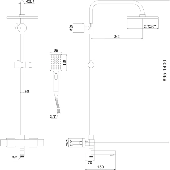 Аэратор, Металлическая розетка, Эксцентрики, Душевой шланг, Душевая лейка, Держатель для душевой лейки, Верхний душ, Кронштейн, Штанга душевая, Термостат