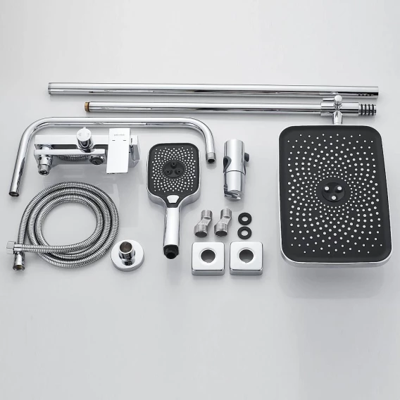 Аэратор, Металлическая розетка, Эксцентрики, Душевой шланг, Душевая лейка, Держатель для душевой лейки, Верхний душ, Смеситель, Кронштейн, Штанга душевая