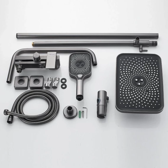 Аэратор, Металлическая розетка, Эксцентрики, Душевой шланг, Душевая лейка, Держатель для душевой лейки, Верхний душ, Смеситель, Кронштейн, Штанга душевая