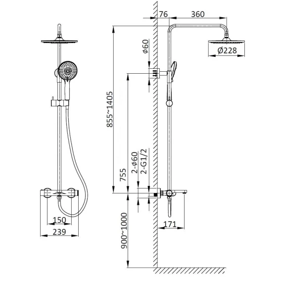 Душевая система Vincea Rondo VSFS-1R1GM 228 мм, со смесителем, вороненая сталь