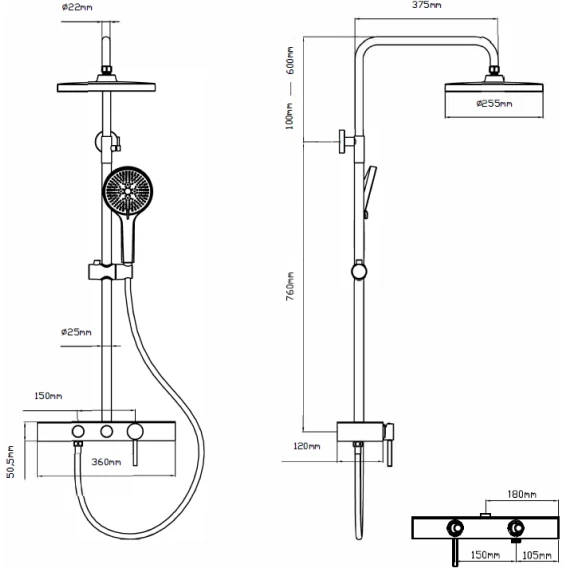 Металлическая розетка, Душевой шланг, Душевая лейка, Держатель для душевой лейки, Полочка, Верхний душ, Смеситель, Кронштейн, Штанга душевая