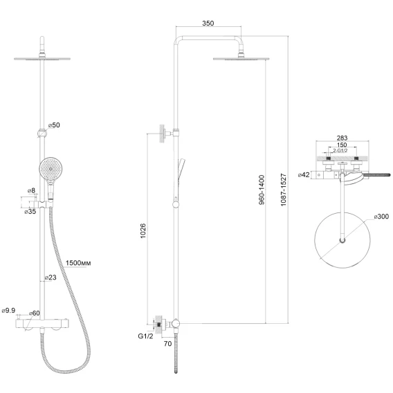 Металлическая розетка, Эксцентрики, Душевой шланг, Душевая лейка, Держатель для душевой лейки, Верхний душ, Кронштейн, Штанга душевая, Термостат
