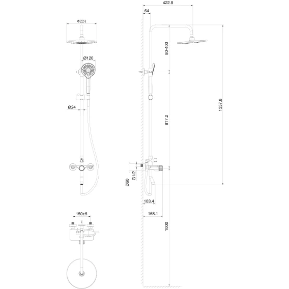 Душевая система Wonzon & Woghand Click WW-N3S962-MB 224 мм, со смесителем, черный матовый