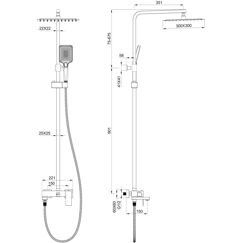 Аэратор, Металлическая розетка, Эксцентрики, Душевой шланг, Душевая лейка, Держатель для душевой лейки, Верхний душ, Смеситель, Кронштейн, Штанга душевая