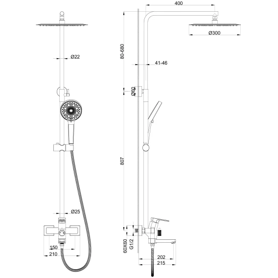 Аэратор, Металлическая розетка, Эксцентрики, Душевой шланг, Душевая лейка, Держатель для душевой лейки, Верхний душ, Смеситель, Кронштейн, Штанга душевая