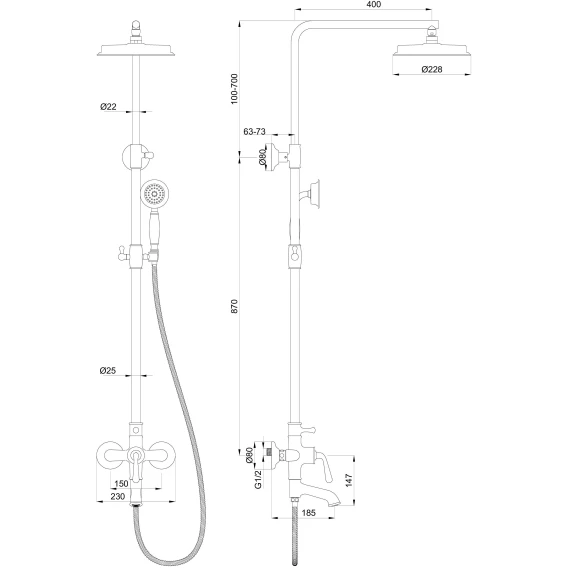 Аэратор, Металлическая розетка, Эксцентрики, Душевой шланг, Душевая лейка, Держатель для душевой лейки, Верхний душ, Смеситель, Кронштейн, Штанга душевая