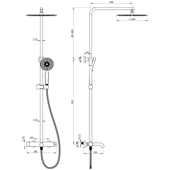 Аэратор, Металлическая розетка, Эксцентрики, Душевой шланг, Душевая лейка, Держатель для душевой лейки, Верхний душ, Смеситель, Кронштейн, Штанга душевая