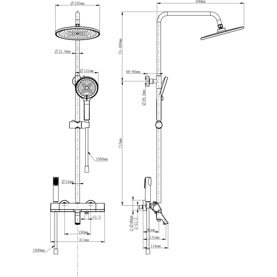 Аэратор, Металлическая розетка, Эксцентрики, Душевой шланг, Душевая лейка, Держатель для душевой лейки, Верхний душ, Кронштейн, Штанга душевая, Термостат