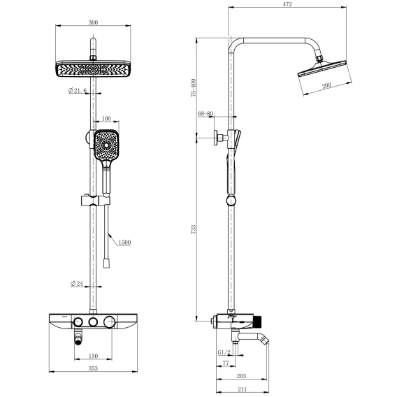 Аэратор, Металлическая розетка, Эксцентрики, Душевой шланг, Душевая лейка, Держатель для душевой лейки, Полочка, Верхний душ, Кронштейн, Штанга душевая, Термостат