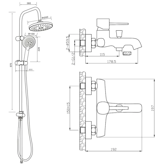 Аэратор, Душевой шланг, Душевая лейка, Держатель для душевой лейки, Верхний душ, Смеситель, Кронштейн, Штанга душевая