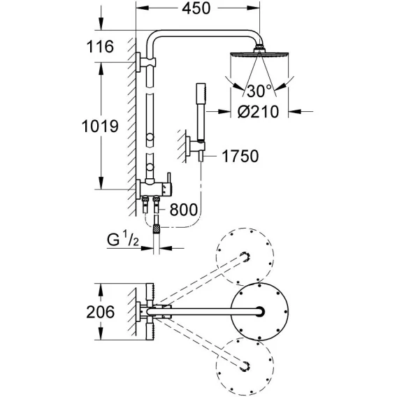 • доступ воды к смесителю/подключению душевого шланга 800 мм через соединение с резьбой 1/2"