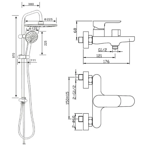Аэратор, Металлическая розетка, Эксцентрики, Душевой шланг, Душевая лейка, Держатель для душевой лейки, Верхний душ, Смеситель, Кронштейн, Штанга душевая