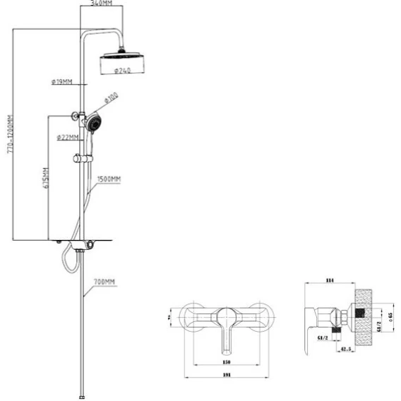 Металлическая розетка, Эксцентрики, Душевой шланг, Душевая лейка, Держатель для душевой лейки, Полочка, Верхний душ, Смеситель, Кронштейн, Штанга душевая