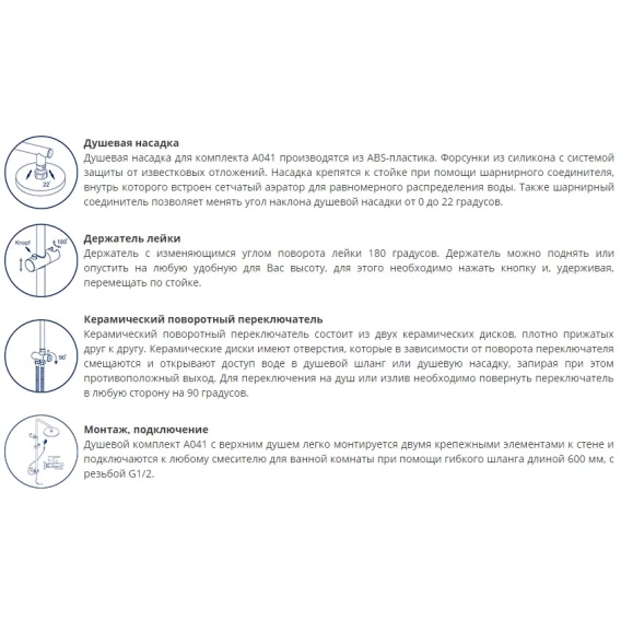 Крепление, Гибкая подводка, Держатель для душевой лейки, Верхний душ, Штанга душевая